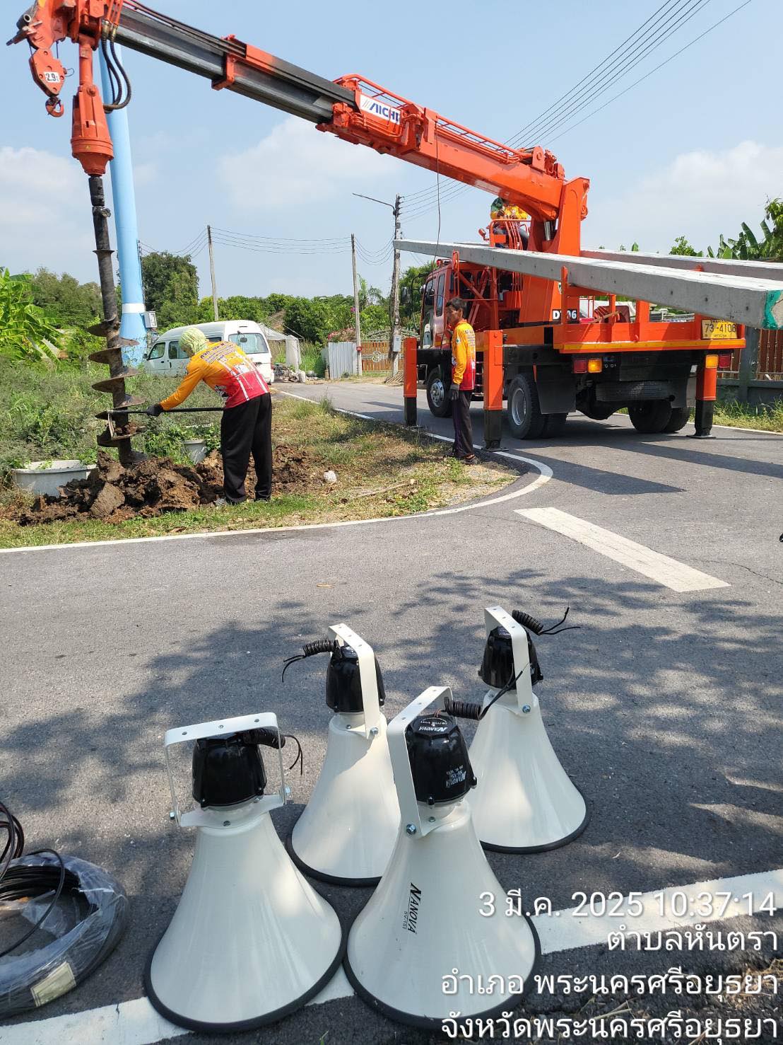 ปักเสาติดเครื่องกระจายเสียงแบบไร้สาย อ.บ.ต.หันตรา